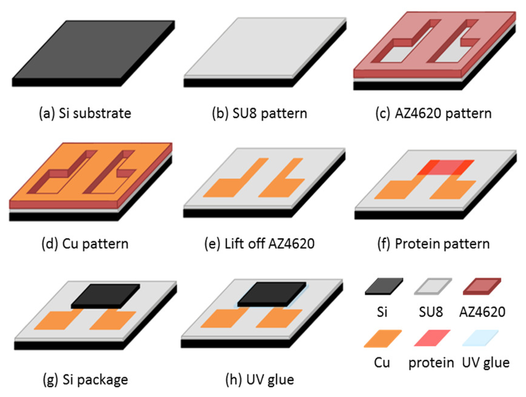 The SU-8 thin film was hard-baked at 100 °C for 3 min after developing. We used a lift-off process to deposit the copper pattern. The photoresist mask was AZ4620. The AZ4620 was spun at 2,500 rpm to achieve sufficient thickness for the lift-off process. We then deposited the copper layer by thermal evaporation and lifted off the AZ4620 layer by immersing in acetone. The patterned electrodes were separated. The thickness of the copper electrodes was approximately 1,000 nm. The chip was then subjected to a UV/ozone process to change its hydrophobicity. The protein solution was dropped on the chip, which remained static for 60 s, and was then spin-coated at 600 rpm for 10 s. Finally, we dried the chip for 4 h in a vacuum glove box (∼10−2 Torr). The chip was then packaged using silicon and UV glue with 5 min exposure under a UV lamp.