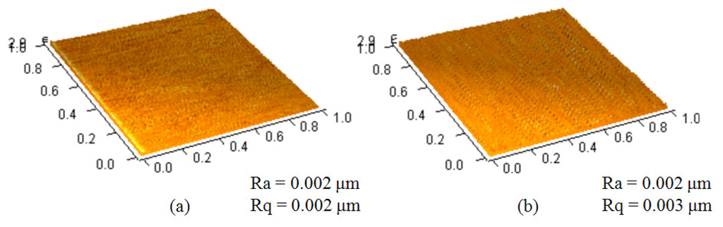 We chose SU-8 photoresist as a substrate layer to deposit the cytochrome c protein since the hydrophobicity of SU-8 photoresist could be changed by treating the epoxy functional group [15]. There are reports showing how to change the epoxy functional group into others, such as an amino [16] or thiol functional group [17]. The UV/ozone process turns the epoxy functional group of the SU-8 photoresist surface into C=O and the phenol group (benzene-OH) [18], which are highly polar overall. Since cytochrome c has a calculated dipole moment greater than 300 Debye [19], we assumed it can be attached to an SU-8 photoresist by dipole-dipole interaction. We changed the UV/ozone process time to control the hydrophobicity of the SU-8 photoresist. The lamp of the UV/ozone cleaner (model UV-1, Samco) is 110 W at a wavelength between 254 nm and 182 nm. The oxygen flow rate is 0.5 L/min. We used an atomic force microscope (AFM, OBJ-204C, ITRI, Hsinchu, Taiwan) to measure the surface roughness of the SU-8 photoresist before and after UV/ozone treatment for four minutes. The images were all taken at a scan size of 1 × 1 μm2 with a 128 × 128 pixel2. As can be seen from the measurements in Figure 3, the average surface roughness (Ra) and the root-mean-square surface roughness (Rq) were almost the same, approximately 2 nm. This shows that the UV/ozone usage did not change the surface roughness significantly.