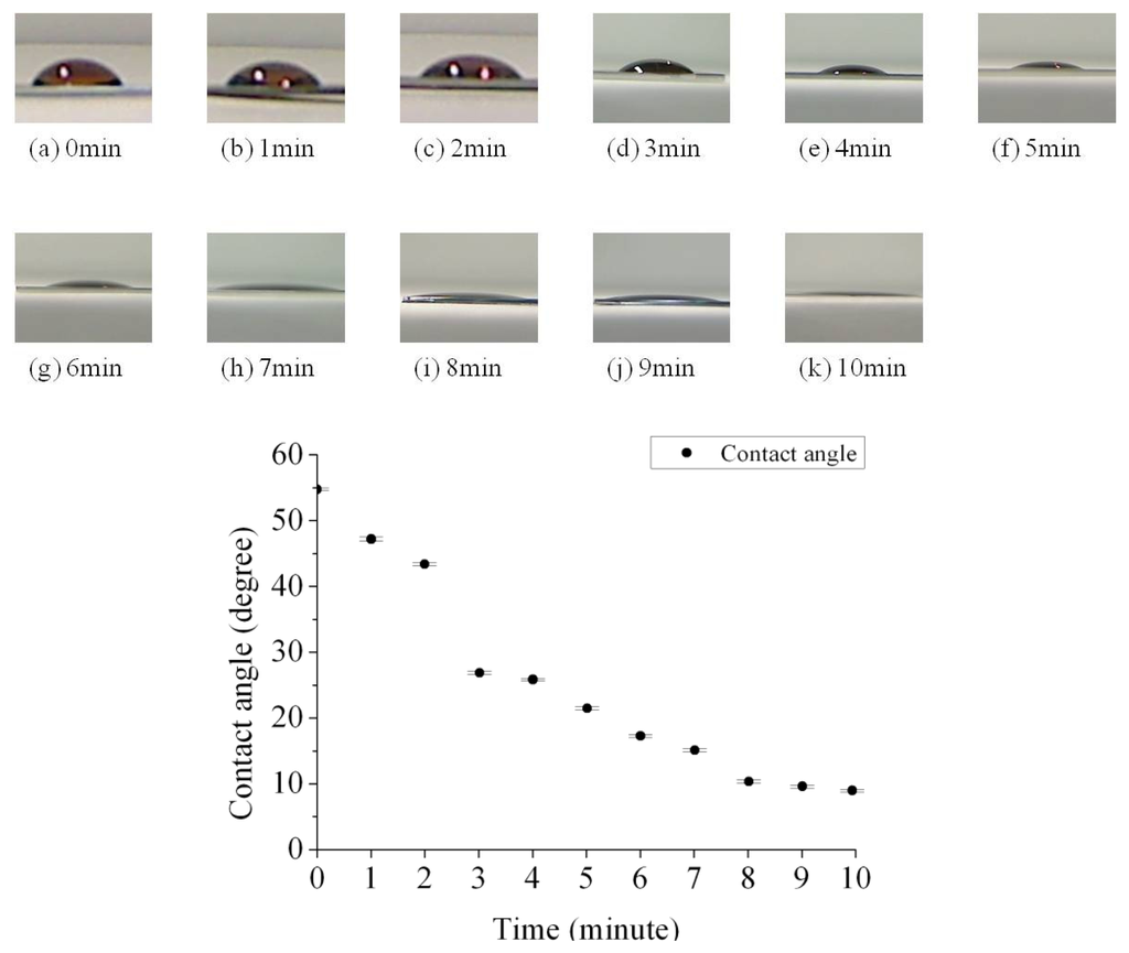 We can determine how the hydrophobicity was affected by the UV/ozone process time through measuring the contact angle. The contact angles between the protein solution and the SU-8 photoresist under different UV/ozone treatment time are shown in Figure 4. We observed that the SU-8 photoresist surface became more hydrophilic after an increased UV/ozone process time. The plot summarizes the experimental result of contact angles between a protein droplet (∼10 μL) and the SU-8 photoresist layer from zero to ten minutes UV/ozone treatment. The measurement setup was based on the Sessile Drop Method [20]. The contact angle decreased monolithically with increased UV/ozone treatment time. It can be seen that after the UV/ozone process the contact angle was decreased from 55 degrees to around 10 degrees.