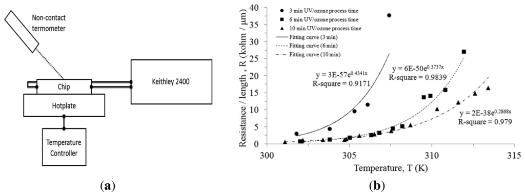 The cytochrome c protein thin film presents an exponential increasing resistance as the temperature rises. In comparison to the chip under different UV/ozone process time, they all exhibit a similar trend. We fitted the curves and used the expression: