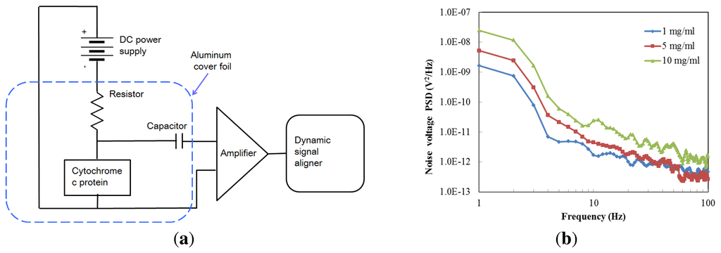 The noise characteristics of cytochrome c were represented by averaging 20 runs; the results are shown in Figure 7b. We prepared three different protein concentrations in order to study the noise performance. The noise values of the cytochrome c thin film were 2.33 × 10−13 V2/Hz, 2.02 × 10−12 V2/Hz, and 2.56 × 10−12 V2/Hz, at 60 Hz with a protein concentration of 1, 5 and 10 mg/mL, respectively. These values are lower than those reported for α-Si (1.1 × 10−6 V2/Hz) [21]. The results show that a lower concentration of the cytochrome protein was less noisy.