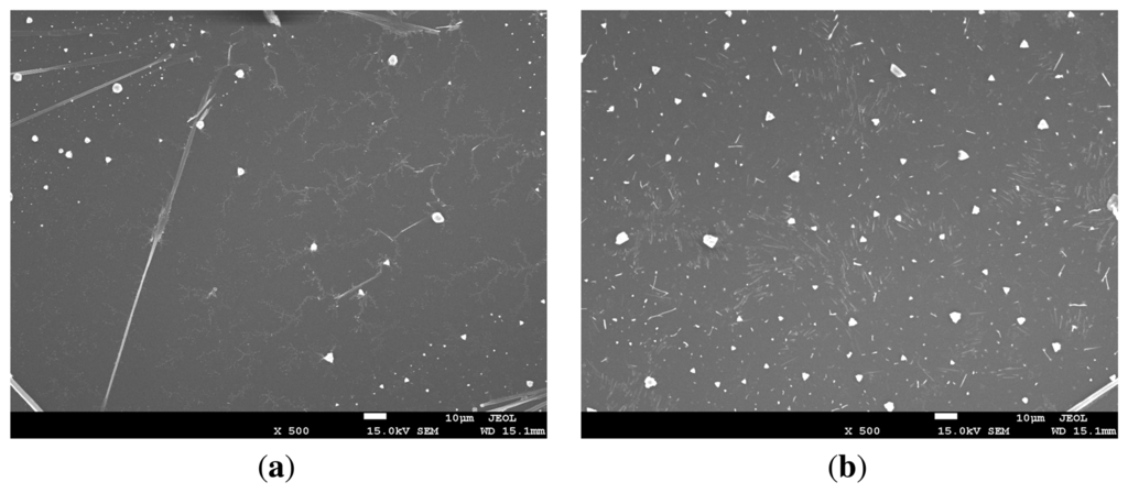 In Figure 9 cytochrome c thin film surfaces are shown. The film in Figure 9a was fresh and the resistance could be measured. The film in Figure 9b was heated at 45 °C for one hour in an ambient environment which made the resistance immeasurable and irreversible. It can be seen from the SEM images that the surface of a fresh protein thin layer was relatively smooth with few cracks. Under high temperature and air, the protein surface became cracked and the resistance of the thin film increased.