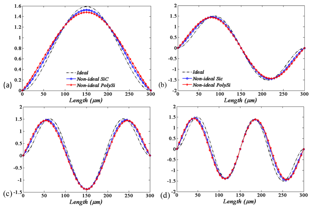 By solving the eigenvalue problem of Equation (16), the first four values of new natural frequencies of the beam in the presence of the springs are obtained, as shown in the fourth to seventh columns of Table 3. It demonstrates that the natural frequencies of the beam will be smaller when considering the flexible boundary conditions. It is also shown that the natural frequencies with the “soft material” (polysilicon) flexible supports conditions will be smaller compared with those under the “hard material” (silicon carbide) supports conditions. The corresponding mode shapes compared to those of ideal boundary conditions are shown in Figure 3.