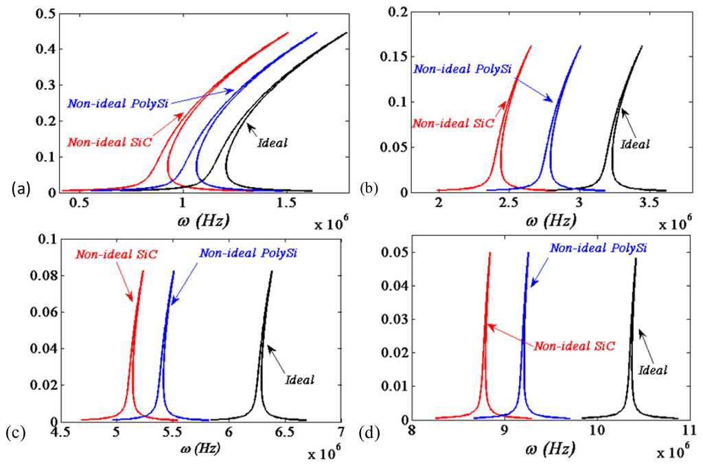 In Figure 4, the first four frequency response curves are compared between the ideal and non-ideal boundary condition cases as c = 0.6, f = 4, respectively. The polysilicon microbeam has the material properties: Young's modulus E = 150 GPa, density ρ = 2.3 × 103kg/m3 and Poisson's ratio νs = 0.226. It is shown that small variations of deflections and moments at the ends would affect the frequencies of the response, deviations from the ideal conditions lead to a drift in the frequency-response curves.