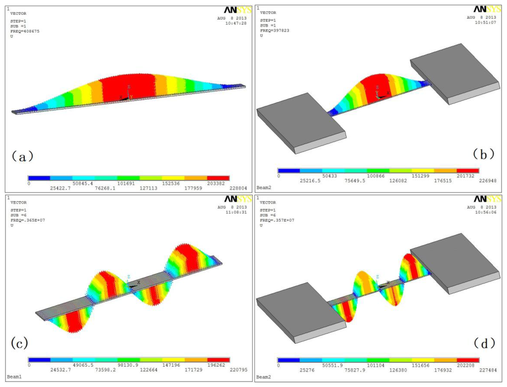 From Equations (2) and (4), it is known that the softer the support material is, the smaller the equivalent stiffness will be. Furthermore, it is easily observed from Figure 4 that the smaller the equivalent stiffness is, the smaller the resonance frequencies of the MEMS beam resonators will be.