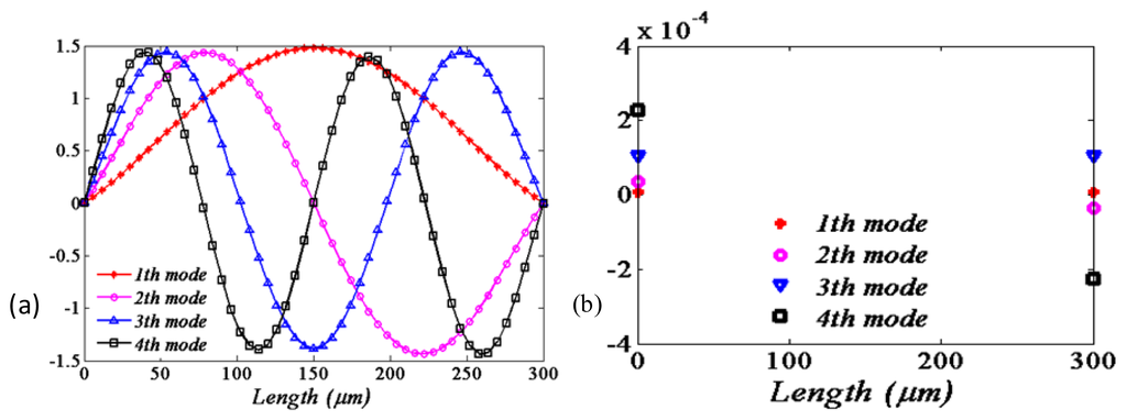 Figure 6a illustrates the first four mode shapes corresponding to the natural frequencies as listed in Table 5, where polysilicon is used as the support material. The partial enlarged figure of each mode is intercepted as shown in Figure 6b, where both ends displacements of the flexible supports boundary are displayed. The numerical results are also displayed in the Table 5. It is apparent that the small tangential displacements of both ends are symmetry with the odd mode number, while asymmetry with the even mode numbers. The tangential displacement becomes larger with the higher order modal.