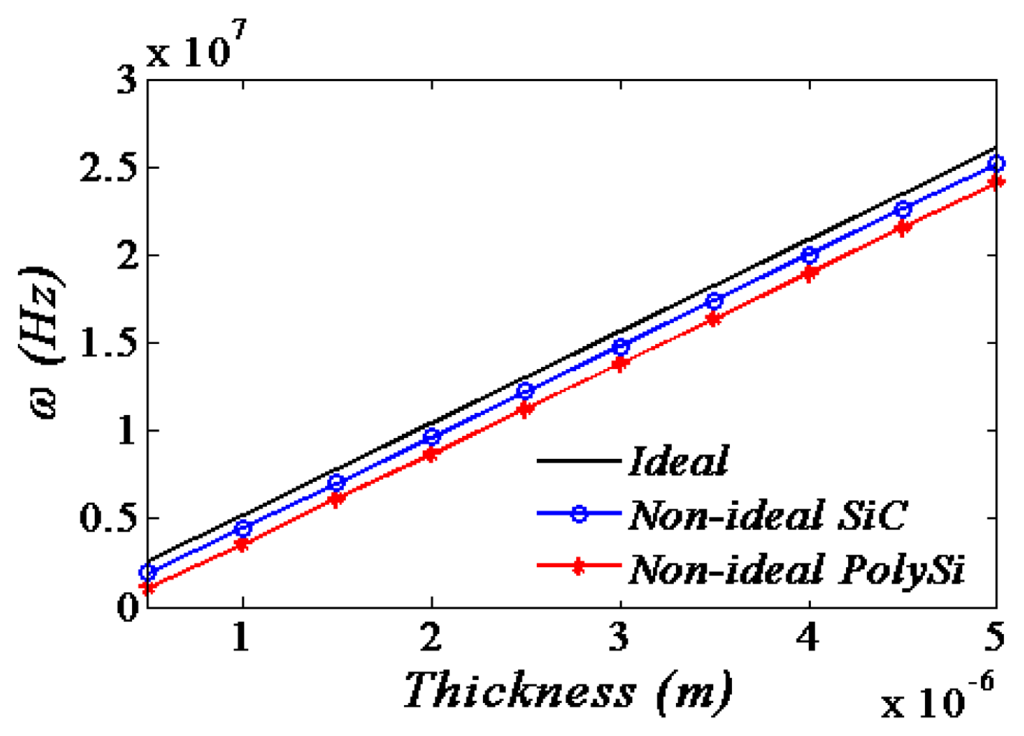 In the above relation, the second term is due to the non-ideal boundary conditions and the third term is due to the nonlinearity mechanical spring. It can be obviously seen that the flexible supports conditions would decrease the resonance frequency while the nonlinearity mechanical spring increase the frequencies. However, it is also apparent of KK that rotational springs become dominant compared to transversal springs as the mode number increases. So it may increase or decrease the frequencies depending on the mode number i and the amplitudes of the supports variations [20]. Therefore, it is easy to infer the effects of the material performances and the geometric sizes of the supports conditions on the resonant frequency from Equation (37). The resonant frequency shift to the beam thickness with respect to the different flexible supports material is shown in Figure 7.