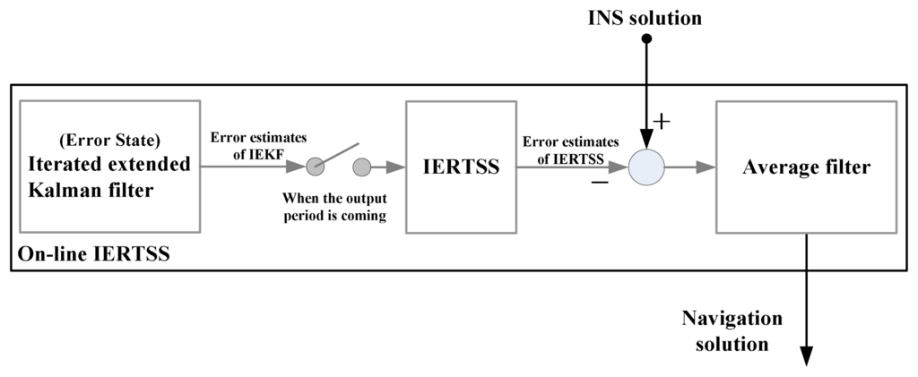 As mentioned above, it can be seen that the filtering output accuracy of ERTSS is dependent on the EKF, however, the EKF will generate truncated errors since it employs Taylor series expansion to linearize the nonlinear system. In this work, in order to obtain a higher accuracy solution, the IEKF mentioned above is used in the forward data processing part of ERTSS (called IERTSS). Moreover, in order to achieve on-line smoothing, this work proposes an on-line IERTSS. The flow chart of this on-line IERTSS is shown in Figure 1. In this mode, the IEKF is used for optimal state estimation. When the output periods are coming, firstly, the IERTSS is employed to smooth the filtering output of IEKF between two data output periods. Then, the average value of the INS state estimation is computed with the INS solution and IERTSS solution.
