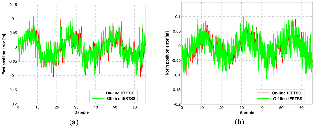 In this section, the comparison of on-line and off-line IERTSS is discussed. The position errors for the off-line and on-line IERTSS are shown in Figure 10. The comparison of on-line and off-line mode in terms of position error is shown in Table 8. From the figures, one can see that both in the east direction and north direction, the position error of the on-line and the off-line IERTSS solutions are almost the same, and the off-line mode is a little better than the on-line mode. Table 9 displays the comparison of on-line and off-line mode in terms of velocity error. Like the position error, the on-line and the off-line IERTSS solutions are also almost the same, and the off-line mode is better than the on-line mode. However, the performance of on-line IERTSS is little better than the ERTSS.
