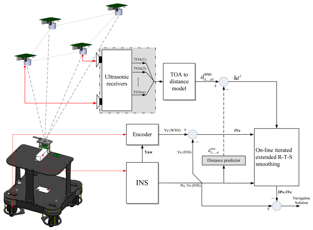 : In order to reduce the estimated errors of the inertial navigation system (INS)/Wireless sensor network (WSN)-integrated navigation for mobile robots indoors, this work proposes an on-line iterated extended Rauch-Tung-Striebel smoothing (IERTSS) utilizing inertial measuring units (IMUs) and an ultrasonic positioning system. In this mode, an iterated Extended Kalman filter (IEKF) is used in forward data processing of the Extended Rauch-Tung-Striebel smoothing (ERTSS) to improve the accuracy of the filtering output for the smoother. Furthermore, in order to achieve the on-line smoothing, IERTSS is embedded into the average filter. For verification, a real indoor test has been done to assess the performance of the proposed method. The results show that the proposed method is effective in reducing the errors compared with the conventional schemes.1. Introduction