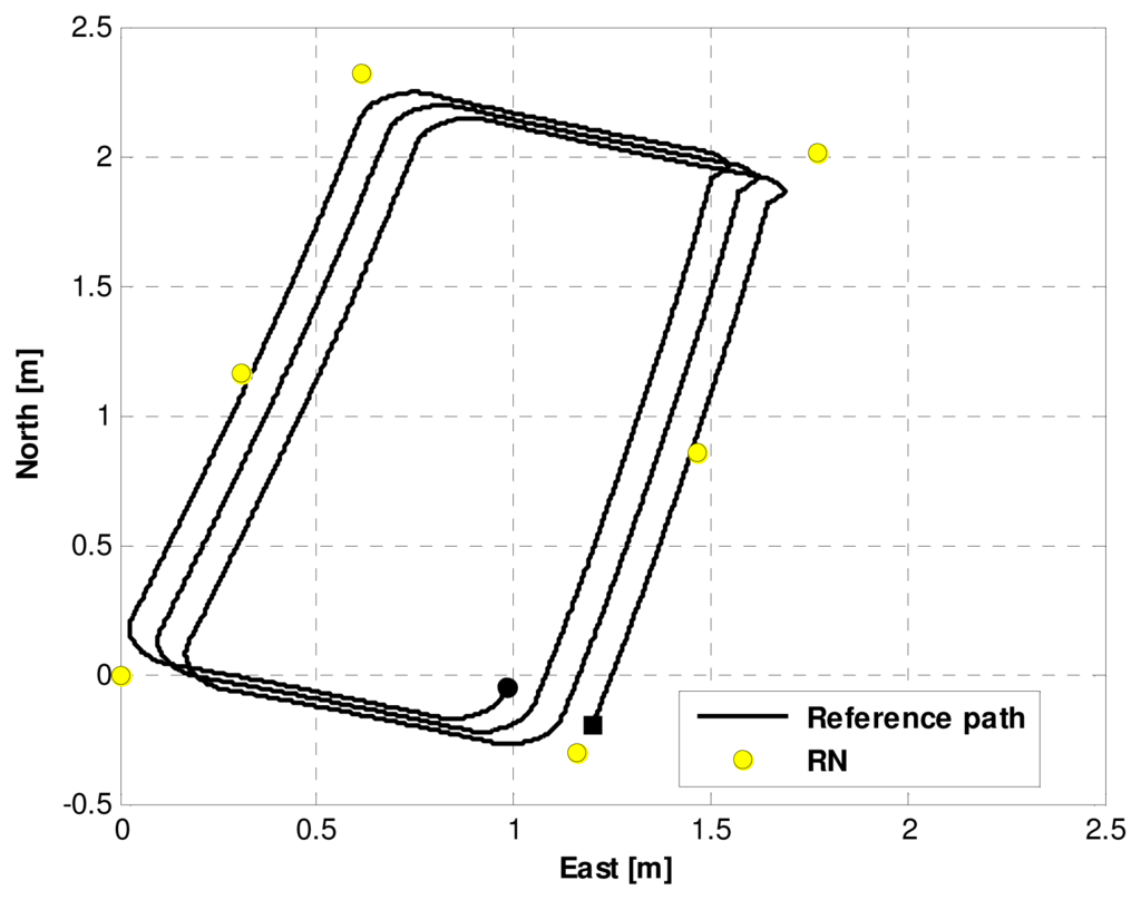 Figure 6 displays the trajectory of the real test. The robot runs from the beginning point (denoted by a black square) to the end point (denoted by a black circle) at a speed of 0.33 m/s. Meanwhile, the RNs are denoted by yellow circles in Figure 6.