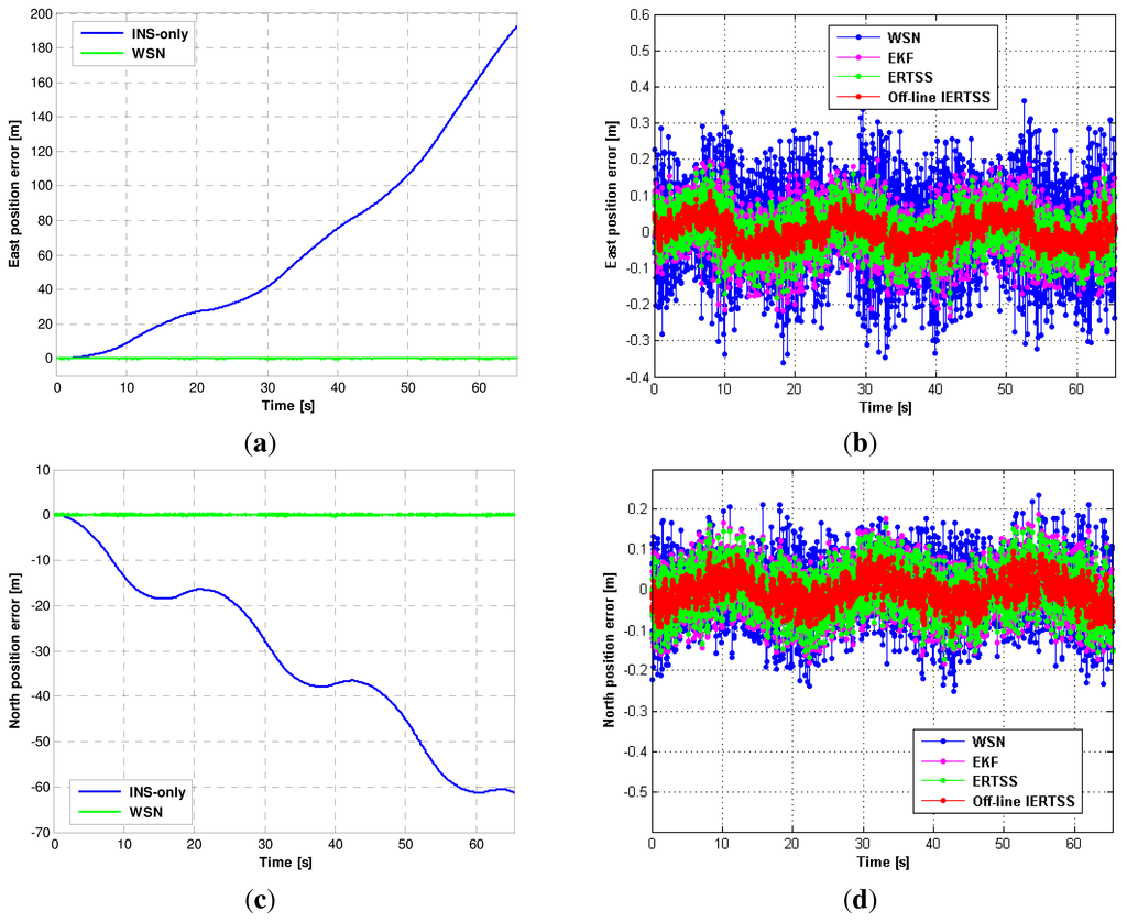 Figure 7a shows the east position error of the INS-only and WSN. From the figure, one can easily see that though the INS-only solution is continuous, and the east position INS error is accumulated since the DR-based current position has to depend on the previous moment. In Figure 7a, the east position INS error increases to about 190 m in 65 s without any correction. The RMSE of the INS-only solution is 85.89 m. Thus, it is necessary to correct the INS solution. Moreover, we can see that the WSN is able to maintain the east position error compared with the INS-only solution. Table 3 shows that its RMSE is 11.78 cm, which is lower than the INS solution. The east position errors for the WSN, EKF, ERTSS and off-line IERTSS are shown in Figure 7b. From the figure, it can be seen that the estimation accuracy in terms of east position for EKF is superior to that for WSN. The EKF reduces the RMSE in the east direction by about 41.17% compared with the WSN solution. Regarding the smoothing methods, it is evident that both the ERTSS and the off-line IERTSS are effective to reduce the RMSE. Table 3 shows that the position RMSE for the off-line IERTSS is lower than that for ERTSS. The off-line IERTSS reduces the position RMSE by about 38.22% compared with ERTSS.