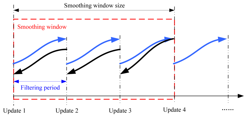 In this section, the relationship between smoothing window size and accuracy for the on-line IERTSS is discussed. The relation between the smoothing window size and the filtering period is shown in Figure 8. From the figure, we can see that the relation can be expressed by the following equation: