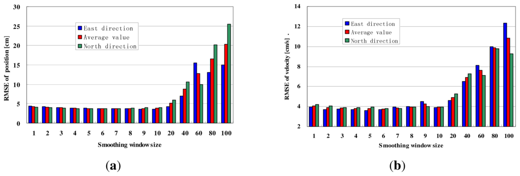 Tables 5 and 6 and Figure 9 show the testing results. From the results, we can see that both the RMSE of position and that of velocity reduce as the smoothing window size increases on the beginning, then the RMSE increases rapidly.