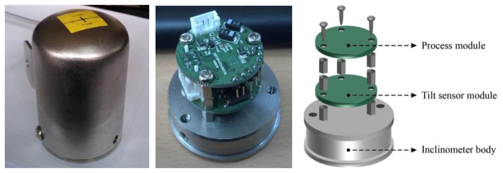 Sensor durability is an essential factor in SHM applications, considering the notably harsh environments at construction sites and over the long term. Miniaturization and light weight design are also necessary factors for increasing the applicability at an actual site. Therefore, the external component of the inclinometer sensor used in this study is constructed of aluminum, which is lightweight and durable (Figure 2), thereby preventing physical damage to the sensor by the harsh external environment. In addition, modules consisting of inclinometer sensors are classified into tilt sensor modules and process modules, thereby affording flexibility in the module arrangement. The modules are manufactured as shown in Figure 2, and the two modules are divided into upper and lower layers to produce a smaller contact area of the inclinometer installed on a structure. The diameter and the height of inclinometer are 50 mm and 78 mm, respectively, and its total weight is 440 g.