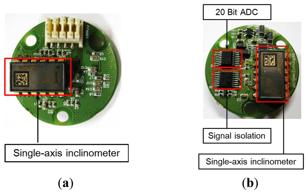 In addition to research and development for sensors in the SHM area, another important issue is the development and application of wireless communication methods. The importance of wireless communication lies in its ability to overcome the many limitations [20,21] that confront the construction of wired monitoring systems in both existing buildings and buildings under construction and economic inefficiency in terms of installation, maintenance, and management of existing wired monitoring systems. The importance of and need for the development of a wireless monitoring system can be verified via the practical applications of existing wireless monitoring systems [3,22]. Various wireless technologies with a variety of sensors have been developed and applied since Straser first reported the practical application of a wireless communication method [23]. However, many technical problems (e.g., power consumption; time synchronization; multi-scale network topologies—i.e., scalability; decentralized data processing; and power-efficient data-driven usage strategies) arise that must be solved before a wireless monitoring system can be applied to various structures on a long-term basis. The application of such a wireless monitoring system is essential for efficient SHM implementation for such structures, which have become increasingly large, tall, and complex. Wireless sensors have been developed and applied in various experiments, and the aforementioned problems have been addressed through an extensive series of experimental studies. However, despite the development of various wireless sensors [24–26] and numerous applications, only a few developmental studies have been conducted on wireless systems for inclinometers, particularly for structures.