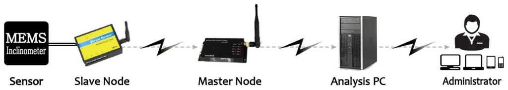 The wireless sensor node refers to both the slave and master nodes, the dimensions and weight of which are 98 × 69 × 33 mm and 300 g, respectively. The slave node is responsible for transmitting the data between the MEMS-based inclinometer and the master node. In this case, the inclinometer and the slave node are connected by a wire, and the slave node is responsible for receiving the output data from the inclinometer sensor unit and wirelessly transmitting the data to the master node located a short distance away (Figure 7). In the slave node, four channels can be configured, and the same number of MEMS-based inclinometer sensors as the number of channels configured can be connected simultaneously in current state; a maximum of 24 channel can be configured in future development.