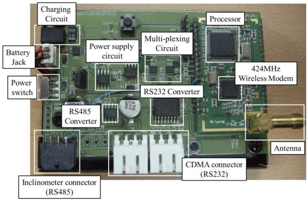 A 2.4-GHz radio frequency (RF) is used as a short-range communication method between the slave and master nodes. The RF wave mode is used for distances between 30 and 120 m. RF waves are suitable for building structures that consist of many structural and temporary members because only slight refraction and diffusion by obstacles occur with these waves. RF waves consume less power during transmission than other communication methods and are therefore well suited to long-term measurement and short-range communication. A CC1020 chip [28] is used as the wireless data conversion device because this device can effectively convert an RF signal with low power. This type of chip is used in many industrial fields. Figure 8 presents a diagram of the interior structure of the slave node. In the slave node, the RS-485 signal transmitted from the MEMS-based inclinometer sensor is passed through the processor in the slave node and is demodulated into an RF signal for wireless communication via the RF integrated circuit (IC). Next, this signal is transmitted wirelessly to the master node. The board of the wireless slave node is shown in Figure 9, which illustrates each component for communication, processing, and power supply.