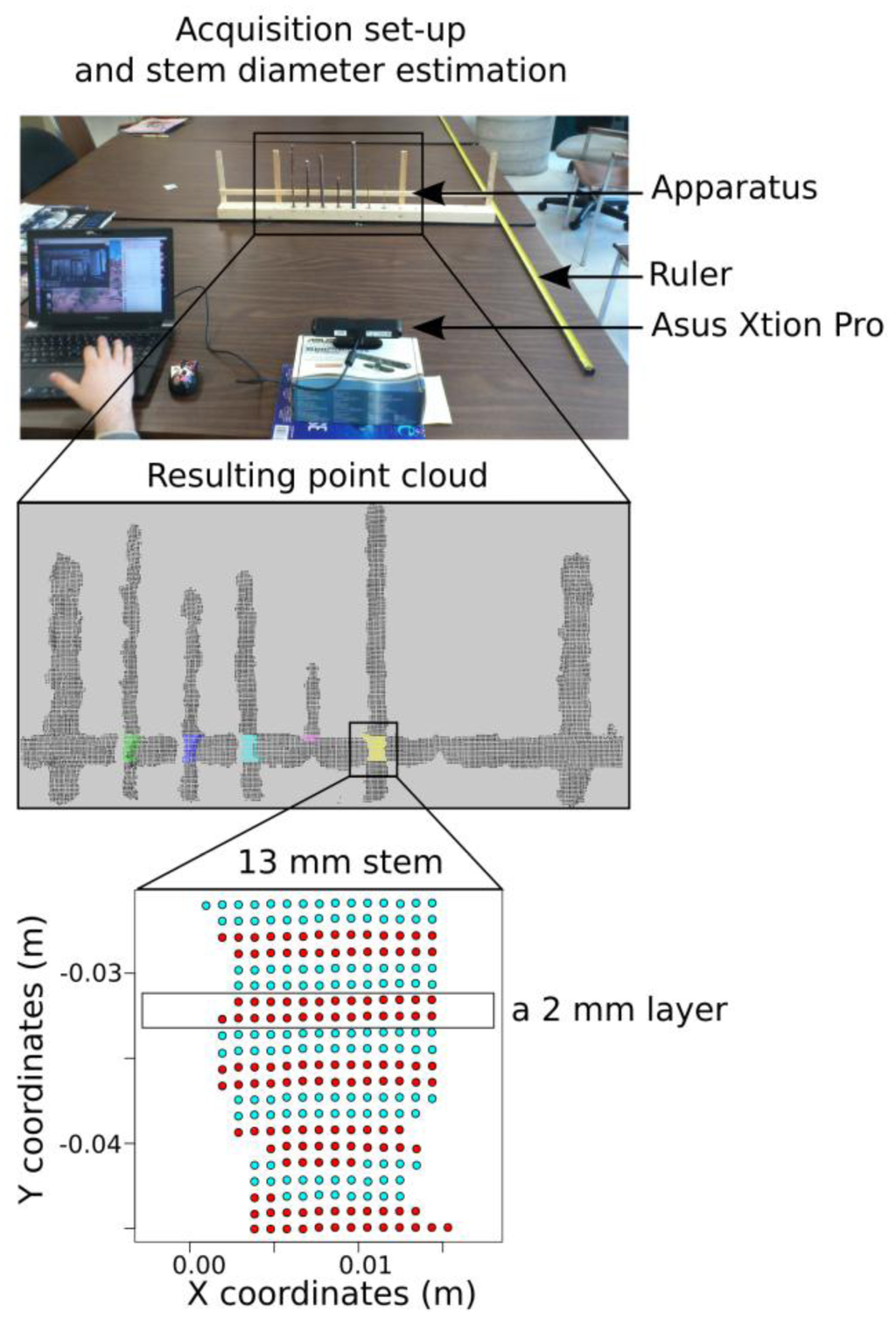 To test the effect of distance from the sensor on the measurement accuracy and detection limit of the sensor, the branch holding apparatus was placed at the end of a long table in the lab facing the Xtion sensor. Starting at a distance of 2.5 m, data was captured (10 images) and then the apparatus was moved 0.25 m closer to the camera (while keeping the apparatus in the center of the cameras view) until the distance between the camera and the apparatus was 0.25 m. The experiment was conducted in a lab with lighting primarily from fluorescent fixtures, some natural daylight from windows, but no direct sunlight.
