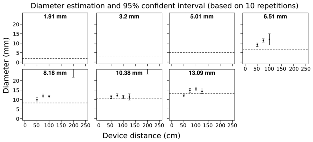 We found that branches below 6.5 mm in diameter were not detected by the camera i.e., there was no point cloud data generated. For branches ∼7 mm in diameter bias was +4 mm, and for branches greater than 7 mm in diameter measurement bias decreased to +2 mm. We found that the accuracy was similar from 0.5 m up until a distance of 1.25 m from the target for all detected branches (Figure 2). Overall, errors were related to overestimation of diameter and the degree of overestimation was generally consistent. Variability among the 10 image captures was also quite small within the optimal 1.5 m scanning distance. Beyond 1.5 m distance, the acquisition quality was quite poor, and in most cases the acquisitions were not analyzed because the branch elements were not well captured (see Method part for details).