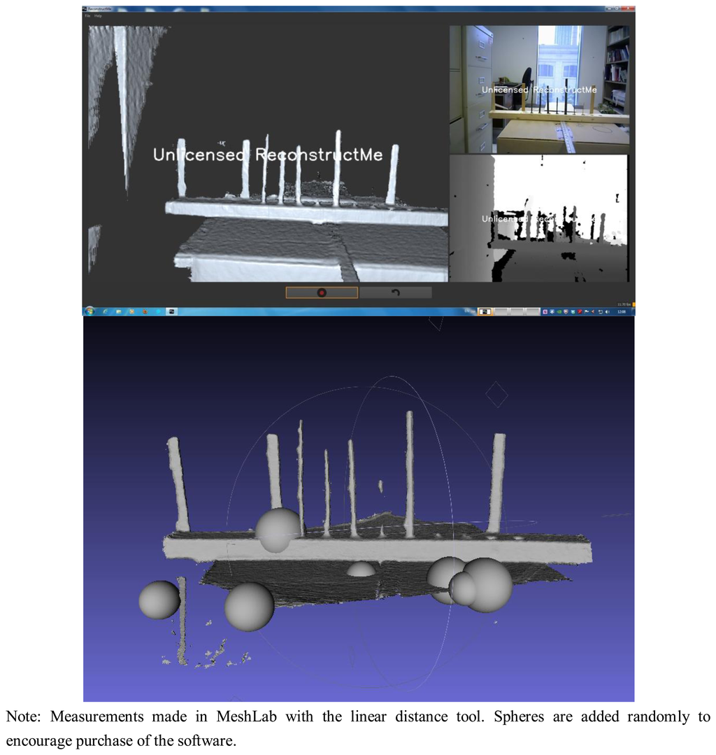 In addition to static acquisitions we also tested the detection ability and accuracy of three popular 3D object scanning and modeling implementations: (1) KinFu from PCL; (2) ReconstructMe; and, (3) Skanect. Differences in the programs are summarized in Table 2.