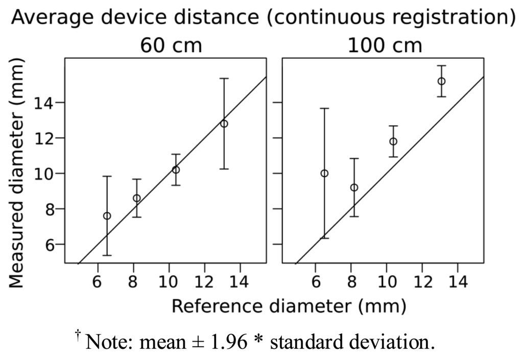 With Skanect, scanning was inhibited by low frame rates when set to the highest detail mode (body, fps < 3–4); similar to scanning at small scales and in high detail mode with ReconstructMe. Although it was not possible to quantitatively compare the accuracy of diameter estimation from Skanect due to the limitations on the resolution of the exported mesh (Figure 6), we qualitatively determined that the measurement performance was quite similar to ReconstructMe (Figure 6).