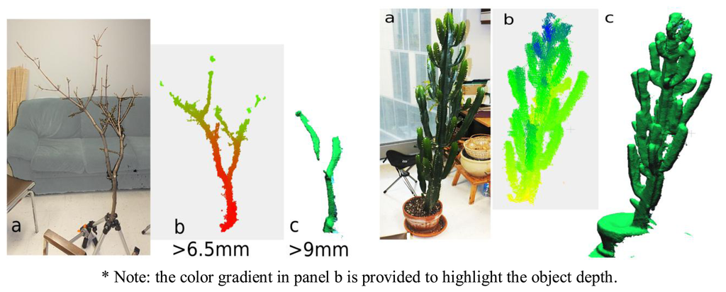 For the maple branch, a number of the smaller diameter branch elements were not captured in the scan. More precisely, of the 41 segments widths for which data were manually recorded on the branch (min: 3 mm; max: 24 mm), those segments with diameters below 6.5 mm were not detected by either static image acquisitions or by 3D scanning with KinFu. For segments between 7 and 9 mm, only static scanning resulted in segment detection, whereas segments ∼10 mm and larger were detected by both methods (we did not have segments >9 mm but <10 mm in diameter). The cactus like euphorbia was well acquired thanks to the width of it axes (Figure 7).