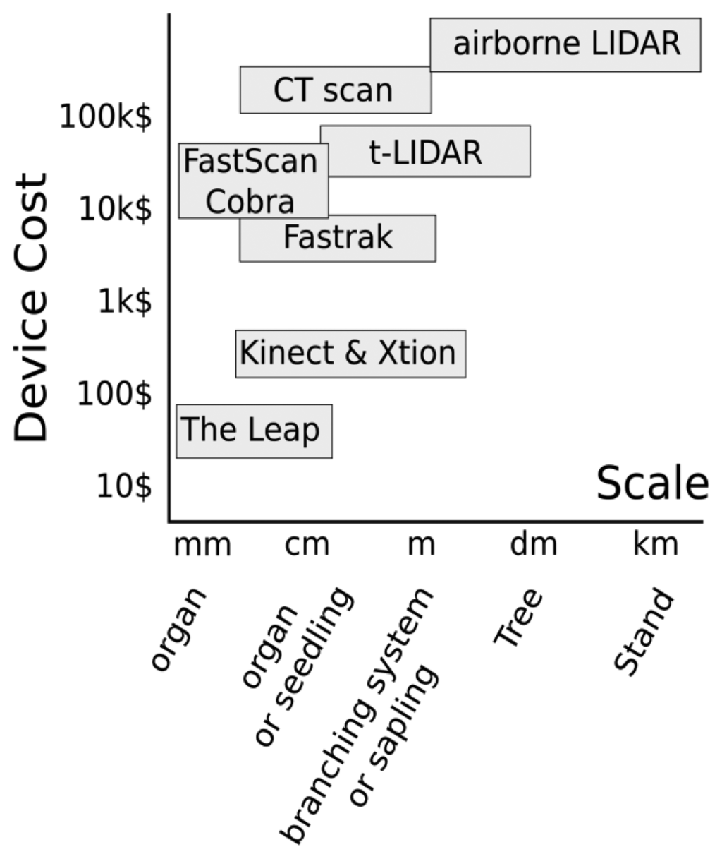 Various devices are available to capture 3D data and there is a large gradient in scale at which data can be generated (Figure 8). 3D magnetic Digitizing (Polhemus Fastrack device) works well for 1 to 10 mm branches and individuals less than 1 m height (seedlings, saplings). Generally, people use a caliper during digitizing to measure diameter and then incorporate it as an attribute associated to segments. For seedlings, measurement time using digitizing is reasonable, requiring somewhere between several minutes to 1 or 2 h depending on crown complexity. As the size and complexity of the target plant increases, digitizing with caliper measurement of diameter becomes less practical and 3D cameras may be more efficient for capturing the majority of the aerial structure of individuals (probably less than 3 m height) since they are capable of detecting 6 mm to at least 50 mm segments. For small to medium sized plants scanning with Xtion from multiple viewpoints to generate point cloud data, may provide a faster alternative than magnetic digitizing. The ratio between measurement time and precision is likely the best for this plant stage and it may be possible to think of measuring a regeneration scene of several individuals as well as leaf on scenes. However, the gain in rapidity of the Xtion will be achieved at the expense of the precision since digitizing records diameter to the closest millimeter.