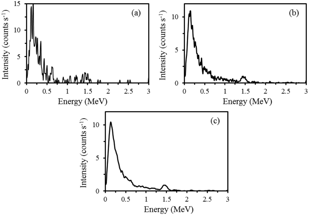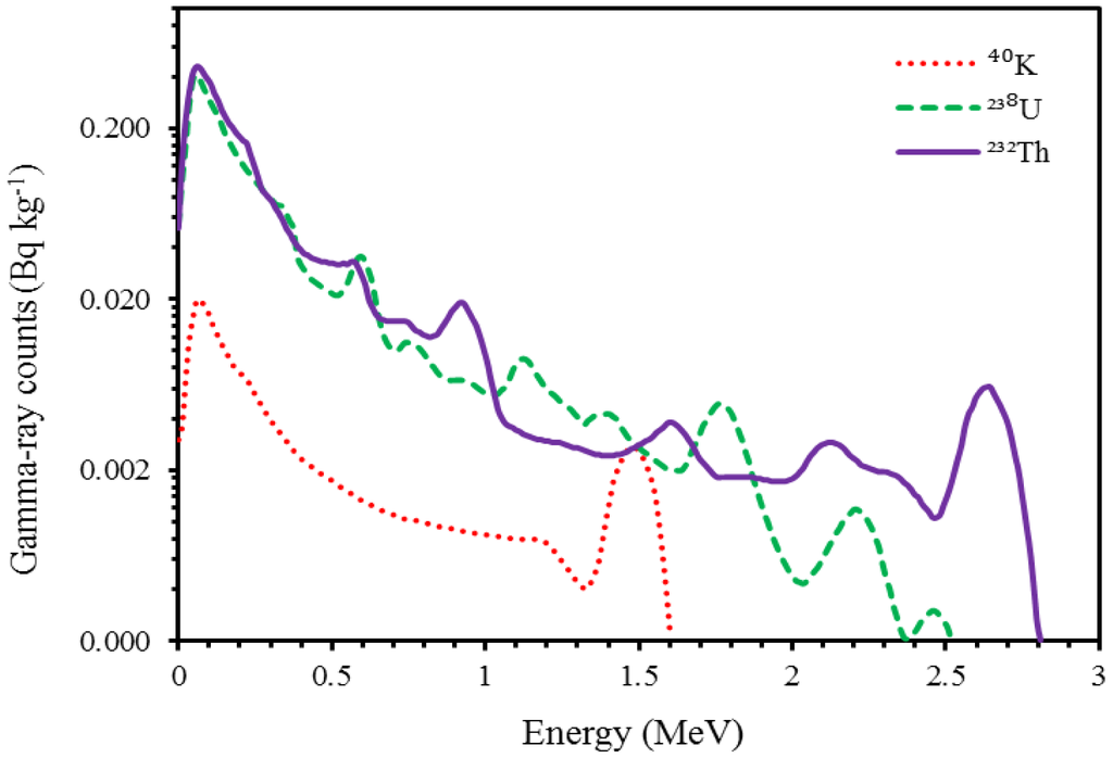 First, the effects of other radionuclides in a certain EW of an element were removed using sensitivity analysis [7]. Second, the count rates were converted to elemental concentrations using stripping algorithms as instructed in IAEA [7]. Stripping factors (e.g., α, β and γ) and sensitivities were determined from the standard spectra (a standard spectrum is the pure response of a detector system to 1 Bq·kg−1 source of a given radionuclide in a given geometrical setting [23] of the spectrometer (Figure 1).