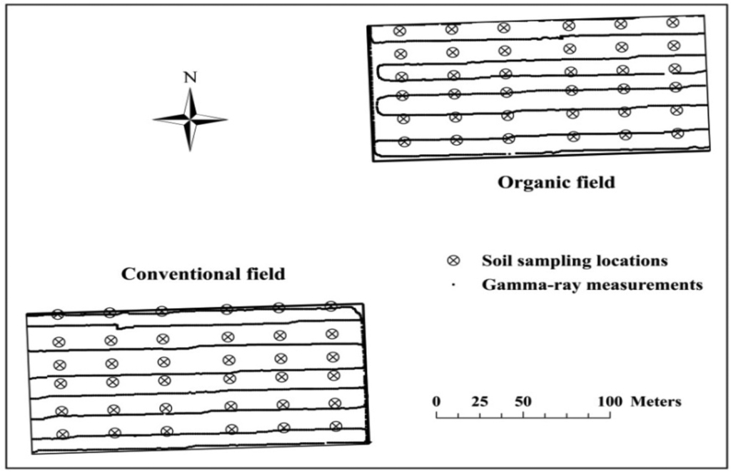 Fine-scale spatial information on soil properties is needed to successfully implement precision agriculture. Proximal gamma-ray spectroscopy has recently emerged as a promising tool to collect fine-scale soil information. The objective of this study was to evaluate a proximal gamma-ray spectrometer to predict several soil properties using energy-windows and full-spectrum analysis methods in two differently managed sandy loam fields: conventional and organic. In the conventional field, both methods predicted clay, pH and total nitrogen with a good accuracy (R2 ≥ 0.56) in the top 0–15 cm soil depth, whereas in the organic field, only clay content was predicted with such accuracy. The highest prediction accuracy was found for total nitrogen (R2 = 0.75) in the conventional field in the energy-windows method. Predictions were better in the top 0–15 cm soil depths than in the 15–30 cm soil depths for individual and combined fields. This implies that gamma-ray spectroscopy can generally benefit soil characterisation for annual crops where the condition of the seedbed is important. Small differences in soil structure (conventional vs. organic) cannot be determined. As for the methodology, we conclude that the energy-windows method can establish relations between radionuclide data and soil properties as accurate as the full-spectrum analysis method.1. Introduction