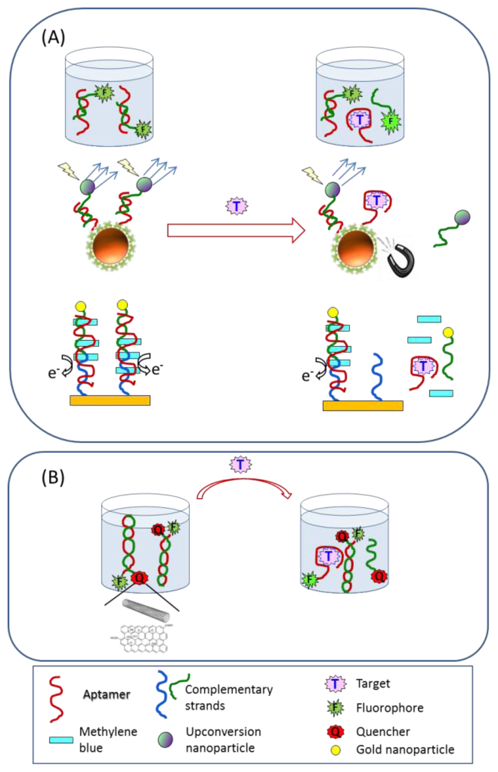 The use of novel materials and multiplexing detection is used for designing a fluorescence resonance energy transfer based assay. This work developed a platform for simultaneous detection of aflatoxin M1 and ochratoxin based on aptamer-modified lanthanide-doped upconversion nanoparticles and GO. The aptamer-NP bound to the mycotoxins cannot bind to GO and its fluorescence intensity cannot be quenched. This multiple sensor has been tested to detect mycotoxins in maize [39].