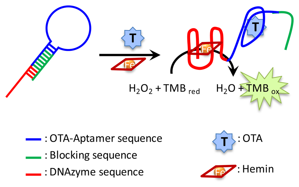 Different formats of signal-on assays based on fluorescence dequenching measurements have also been described (Figure 2B). In a typical assay the aptamer is labeled with a fluorophore which, in the absence of target, is quenched by a complementary DNA containing as quencher tetramethylrhodamine (TAMRA) [29], SWCNTs [30] or poly-vinyl pyrrolidone-protected GO [31]. Upon binding to its target the conformational change of the aptamer leads to the separation between the fluorophore and the quencher, generating an increase in the fluorescent signal related to the target concentration. The first of these tests was applied to the determination of OTA in spiked corn, with recoveries ranging from 83% to 106%. Additionally, the aptamer can be immobilized over nanoparticles such as gold nanoparticles, which act as the quencher of a fluorophore bound to a complementary DNA strand. The interaction with the target results in the displacement of this labeled-strand and in fluorescence recovery [32] showing high sensitivity for OTA detection with a limit of detection of 2 pg/mL. In the described assays, either the needs for aptamer immobilization or labeling may increase their complexity and cost. In an attempt to overcome these limitations a nucleic acid specially designed with a hairpin structure, which includes a peroxidase-mimicking DNAzyme, the sequence of the OTA specific aptamer and a blocking sequence, has been described [33]. In the absence of the target the blocking tail inactivates the DNAzyme, but the formation of the OTA-aptamer complex displaces this tail and the DNAzyme recovers its activity (Figure 3). The assay, although simple, shows limited sensitivity with a limit of detection of 0.1 ng/mL.