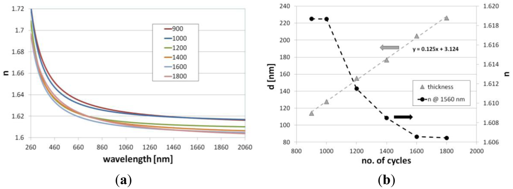 Spectral response of the LPGs to next highly depends on optical properties and thickness of the overlays [7]. The variation in properties of the Al2O3 films deposited on reference Si samples with the number of deposition cycles is shown in Figure 1.