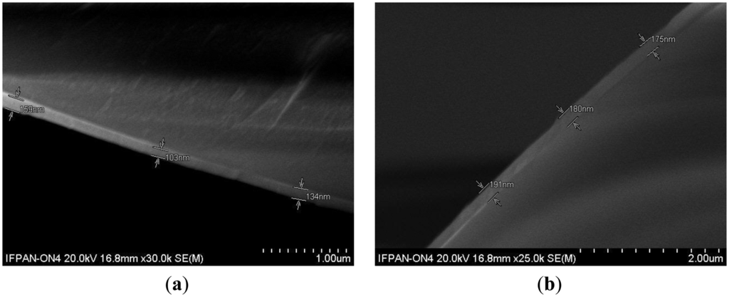 Moreover, the thicknesses of the deposited films have been directly controlled on the fibers by cleaving some of the samples and by measuring the thickness at the fiber cross-section using a Hitachi SU-70 Scanning Electron Microscope SEM (Hitachi High-Tech, Tokyo, Japan).