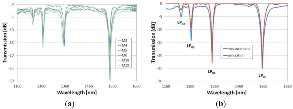 For deposition of the films on the LPGs, a set of gratings has been selected showing a very similar spectral response (Figure 3a). The gratings have resonances at about 1,200, 1,260, 1,350 and 1,550 nm, coming from coupling of LP02, LP03, LP04, and LP05 cladding modes, respectively. The slightly different spectra of the gratings are caused by a limited repeatability of the fabrication procedure. It has been shown that even a very small tapering of the fiber during the arc-induced fabrication process can have a significant influence on the spectrum of the LPGs [27]. Despite the small differences between the gratings fabricated with the arc-method, LPGs are highly resistant to high-temperature post-processing and that is why they are assumed to be a good platform for the experiment [31]. Based on the measured spectra a numerical model of the LPG has been developed. The fitting procedure involved a slight adjustment of the core's n and diameters of both core and cladding. As a result of the fitting, a very good agreement between measured and simulated spectra has been obtained (Figure 3b).