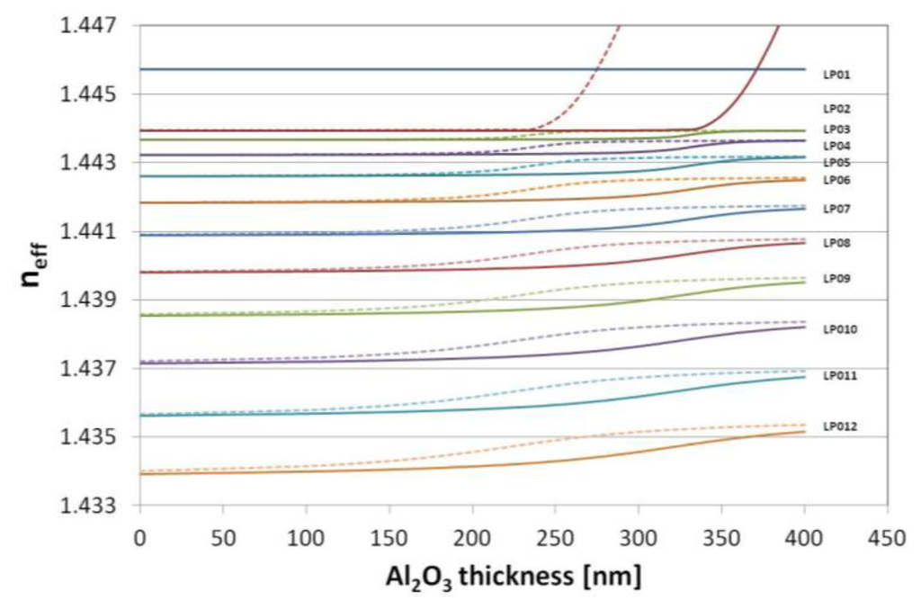The optical simulations were performed using the Optigrating v.4.2 software (Optiwave Systems, Inc., Ottawa, ON, Canada). The software employs LP mode approximation and coupled-mode theory [7,24]. The model of the grating and the fiber is based on fiber datasheet, and grating period is determined during the fabrication process. The model has been adjusted up to experimental data by changes of core and cladding diameter [27]. We assumed dispersion curves of n for each of the Al2O3 films and water according to SE analysis and data given by Damion et al. [28], respectively.