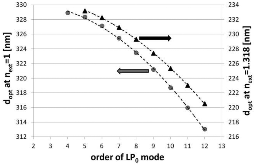 Based on the numerically modeled influence of the Al2O3, an overlay thickness on the effective refractive indices (neff) of the modes up to LP012 has been calculated at λ = 1,550 nm. We assumed here the value of n of the overlay as for 1,200 cycles-long deposition (n = 1.611 RIU, shown in Figure 1). When next is set to 1 (as for air) and 1.318 RIU (as for water at λ = 1,550 [28]), the transition of the modes, resulting in propagation of the lowest order cladding mode (LP02) in the overlay, takes place above 330 and 230 nm of the Al2O3 overlay thickness, respectively (Figure 4). The phenomenon induces a reorganization of all the cladding modes and for higher order modes the transition occurs for the lower overlay thicknesses. Since at the mode transition conditions, the LPGs show the highest sensitivity to variations in the next, the properties of the films must be precisely adjusted for certain range of the next. When the transition is assumed to take place at neff reaching half between of each mode when no coating is applied [7], the approximated optimum thickness (dopt) of the Al2O3 overlay for each mode is plotted in Figure 5. Significantly thinner overlays are required when coupling of higher order cladding modes is taken into consideration for sensing purposes. The determination of properties of the overlays with a high precision as offered by the ALD technique is than highly requested.