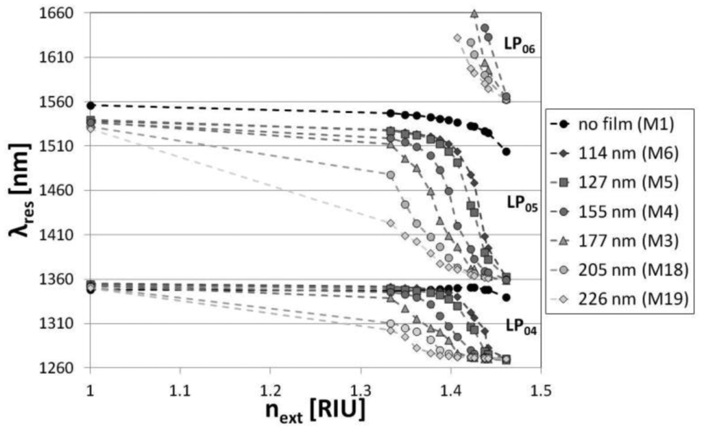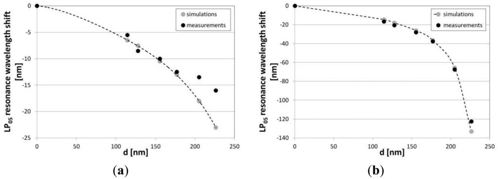 Results of the measurements and simulations have been compared next. A good agreement between theoretical and experimental data for the resonance LP05, which shows the highest sensitivity, can be seen in Figure 6. In our measurements and simulations we had to take into account the dispersion of next. The value of next in visible range (λ = 598 nm) significantly differs from the one in infrared (λ = 1,550 nm). In case of water, the difference reaches almost 0.015 RIU and cannot be neglected when precise measurements are discussed and compared with the results of simulations. When thickness of the Al2O3 overlay increases, the resonances experience a shift towards lower wavelength. An increase in the overlay thickness induces an increase in the effective refractive index of mth cladding modes ( ), and according to the fundamental Equation (1) for the LPGs, where Λ is the period of the grating and is effective refractive index of the propagating core mode, causes a decrease in the resonance wavelength ( ):