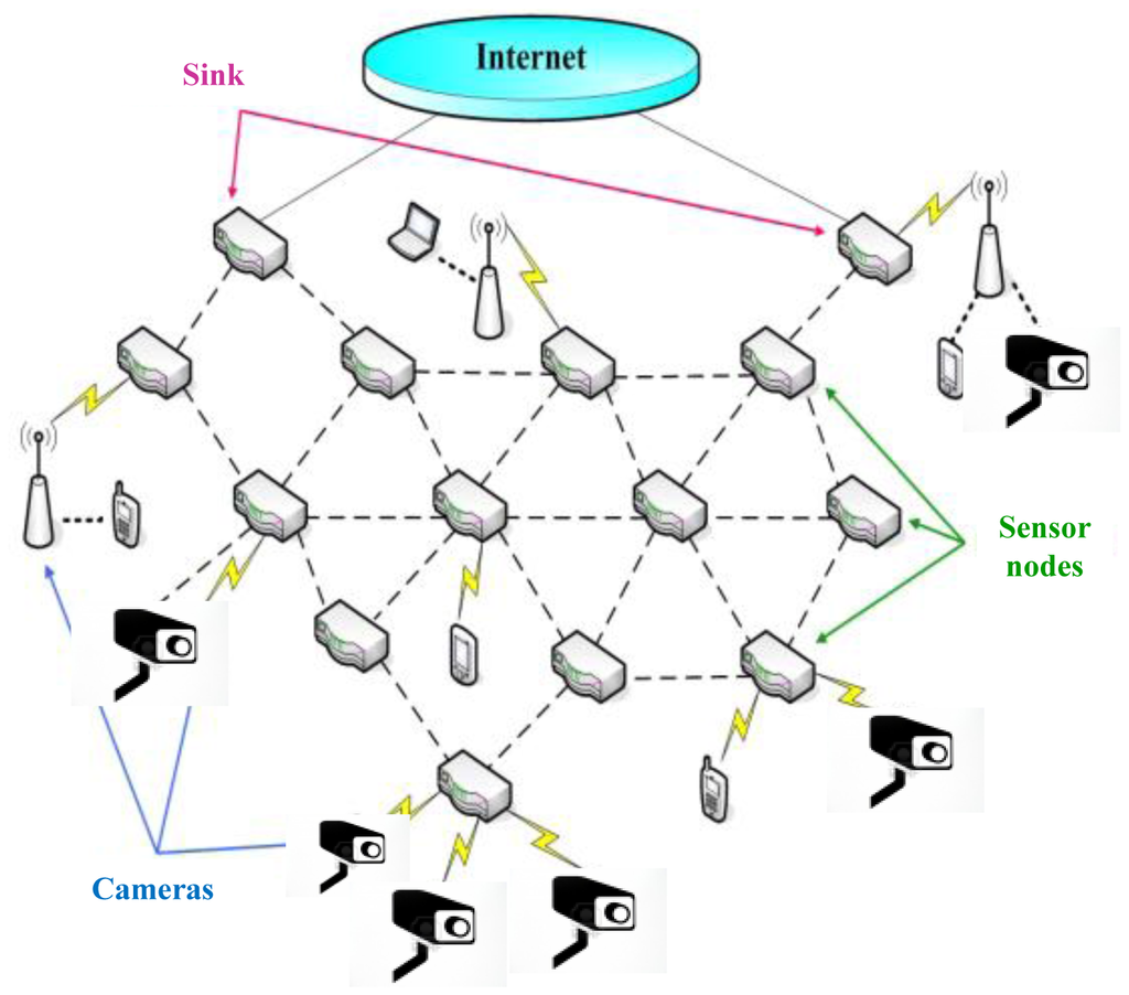 In recent years, Wireless Visual Sensor Networks (WVSNs) have emerged as an interesting field. Popular applications are environmental monitoring, seismic detection, military surveillance, medical monitoring, video surveillance, or the Internet of Things (IoT), etc. [1]. IoT integrates a part of the Future Internet and extends network capabilities to Machine-to-Machine (M2M) communications by a dynamic network infrastructure with self-organization techniques. As compared to a WSN, the camera equipped sensor nodes in WVSNs can capture, process and transmit the real time visual data (images, video). Since the visual data is much larger and complicated than scalar data, delay Quality of Service (QoS) is a challenging issue resource for constrained WVSNs. WVSNs attract more attention on how the camera sensor nodes can cooperatively pass their data more efficiently with minimum delay through the network on a large scale or under realistic physical environmental conditions [2,3]. The architecture of WVSNs is shown in Figure 1.