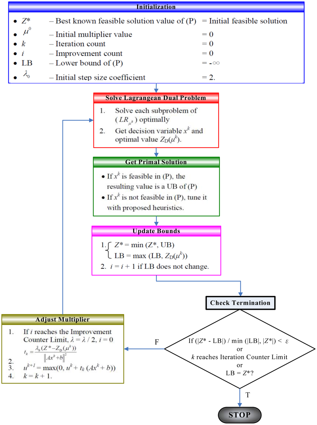 We use the Subgradient Method is used to solve that [26,27] to solve the dual problem (D). First, let the vector S be a subgradient of . In iteration k of the Subgradient Optimization Procedure, the multiplier vector πk = ( is updated by πk+;1 = πk +; tkSk. The step size tk is determined by . is the primal objective function value (an upper bound on ZIP) and λ is constant where 0 ≤ λ ≤ 2.