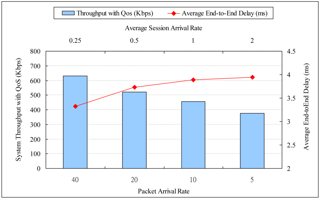 Each session follows one path for routing its required traffic emulated as a real time surveillance streaming data and is not allowed to change during the holding time. The session arrivals followed a Poisson process, and the holding time of each session is set to be an exponential distribution with average 10 s. The experiment with average session arrival rates of 0.25, 0.5, 1 and 2, and the corresponding packet arrival rates are 40, 20, 10 and 5. Figure 4 is shown as the experiment environment which QoS requirements are set in 3 × 3, 5 × 5, 7 × 7 and 9 × 9 squares in 3 ms, 4 ms, 5 ms and 6 ms, respectively.