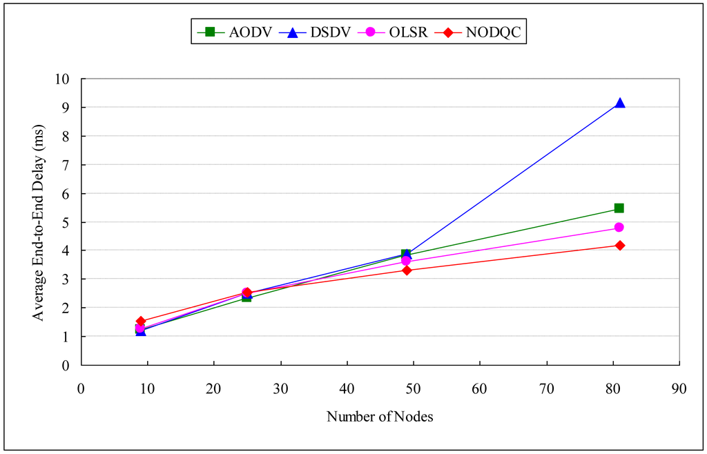 As networks grow in size, the average path of each session lengthens with path selection becoming increasingly important. AE2ED taken in the scalability scenario shows that delay is much less for NODQC as compared to others. As routes break, nodes have to discover new routes which lead to longer E2ED (packets are buffered at the source during route discovery). According to the arc weight on each link is the combination of end-to-end delay from the user perspective and average delay from the system perspective, NODQC can choose other less or non-congested paths for the sessions and balance network-wide the traffic loading. This makes the routing strategy more flexible for making routing decisions for new routing constructions. As far as delay is concerned, NODQC performs better than OLSR, AODV, and DSDV with large numbers of nodes.