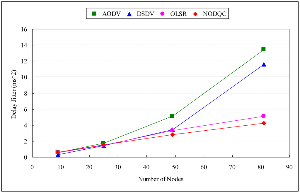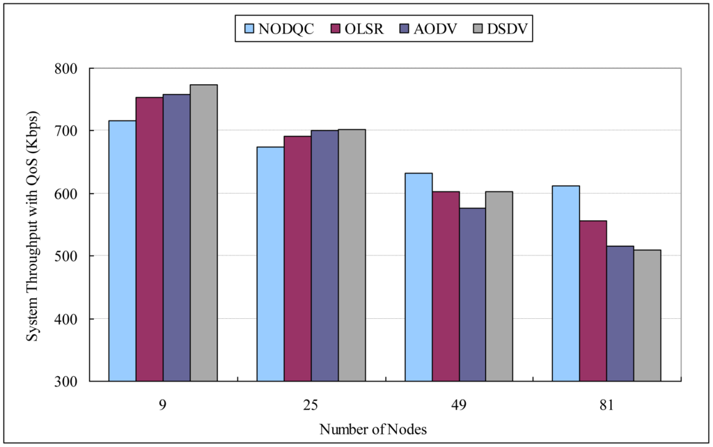 Hence for real time traffic, NODQC is preferred over OLSR, AODV, and DSDV. This is significant for the fact that, as the variations of packet delay becomes more predictable, the routing mechanisms can factor in that delay to determine whether a packet is lost or not. Furthermore, the NODQC also takes QoS provisioning into account for the coming sessions, thereby causing system throughput with QoS satisfaction to be greater than others in larger networks. By taking into consideration both the perspective of the system as we as well as users, the NODQC has proven itself to have lower average end-to-end delay and delay jitter and higher system throughput with QoS satisfaction than other routing algorithms in large-scale networks.