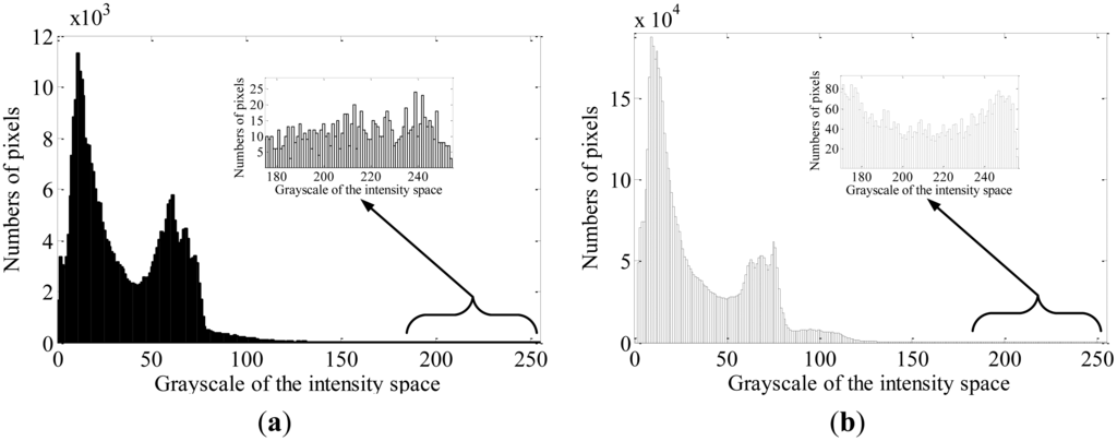 When the camera is installed in host vehicle, the region where the preceding vehicles are most commonly locating is usually taken as the region of interest (ROI). Then, the detection is only performed in the ROI. In this paper, we regard the [200–400] pixels region in the y-axis direction as the ROI. For saving the computation in bright spots extraction, the color image should be transformed into a gray image. We regard the intensity component as the transformed gray image due to the stable brightness of the taillights. The intensity histogram of a single frame and the cumulative intensity histogram of consecutive fifteen frames are respectively shown in Figure 1 where the cumulative brightness histogram is calculated by Equation (1):