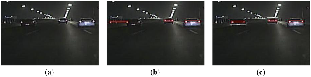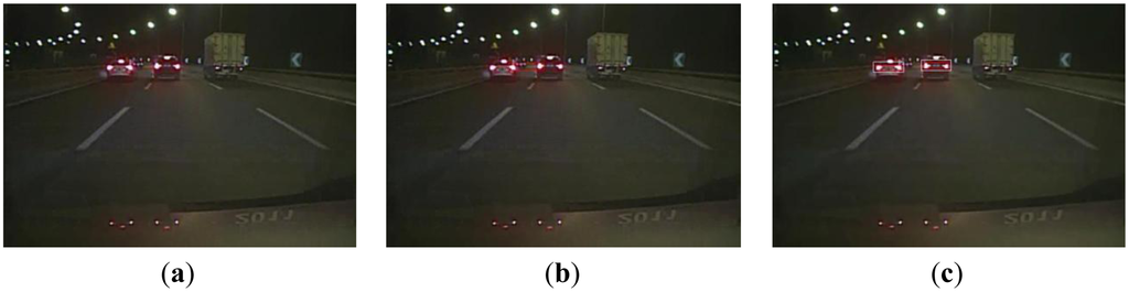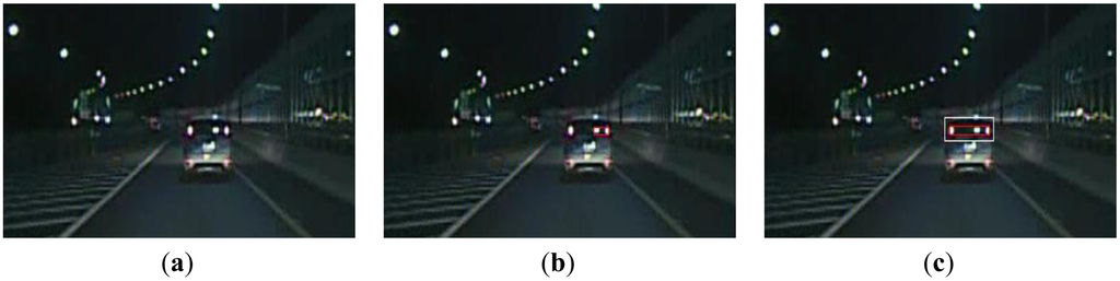 Figure 7 displays a scene of multiple preceding vehicles at almost the same distances from the host vehicle in the image. The features of these different preceding vehicles are similar and satisfy all the detection rules. As the taillights of the adjacent vehicles in the left have similar location, size, color, shape and symmetry features, this leads to a false detection, as shown in Figure 7b. However, the proposed algorithm could eliminate this false detection, as shown in Figure 7c.
