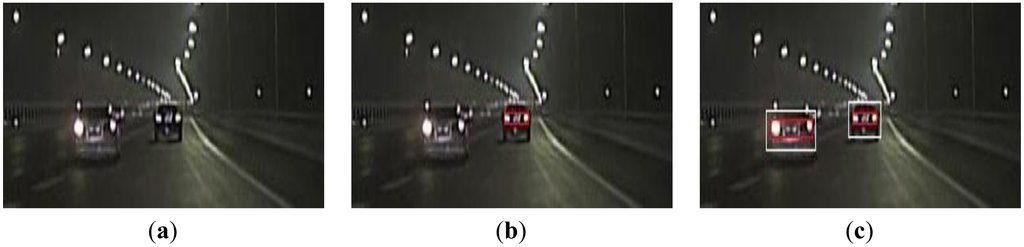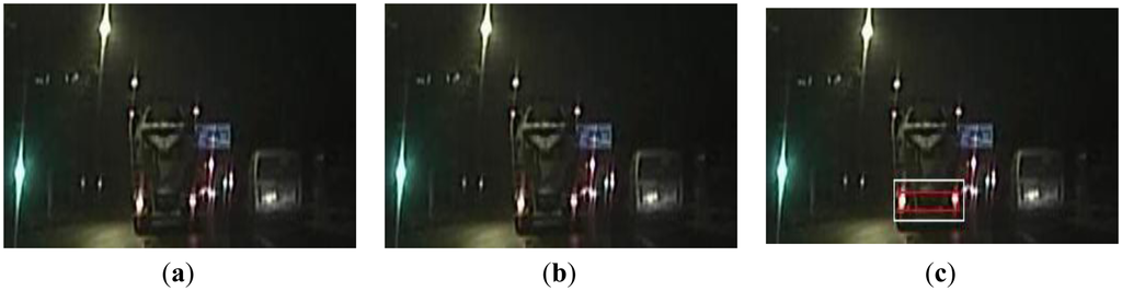 Figure 9 shows a scene where the symmetry of a pair of taillights being broken when the left steering lamp is working. The existing global detection algorithm would cause a false negative detection, as shown in Figure 9b. As the symmetry threshold is adapted real-time in the proposed algorithm, it is adaptive to the traffic scene changes. Thus, the taillights can still be paired accurately. Figure 10 describes a scene where a reflective light block is in the middle of a pair of taillights, and the light spot is strikingly similar to the right taillight. A false detection occurs due to the global detection algorithm in this case, as shown in Figure 10b. However, the proposed algorithm obtains the correct result, as shown in Figure 10c. For the scene where the taillights are distorted because of the vibrations of the host vehicle, the detection results by the two algorithms are shown in Figure 11. Due to the vibrations of the host vehicle, the similarity of taillights does not satisfy the rule of the global algorithm, thus a false negative detection occurs. By utilizing the adaptive thresholds, the proposed algorithm could derive the right result, as shown in Figure 11c. In summary, the adaptive thresholds based on the tracked PR make the detection adapt to the practical traffic scenes, and thus the false positive and false negative detection rates can be reduced simultaneously.