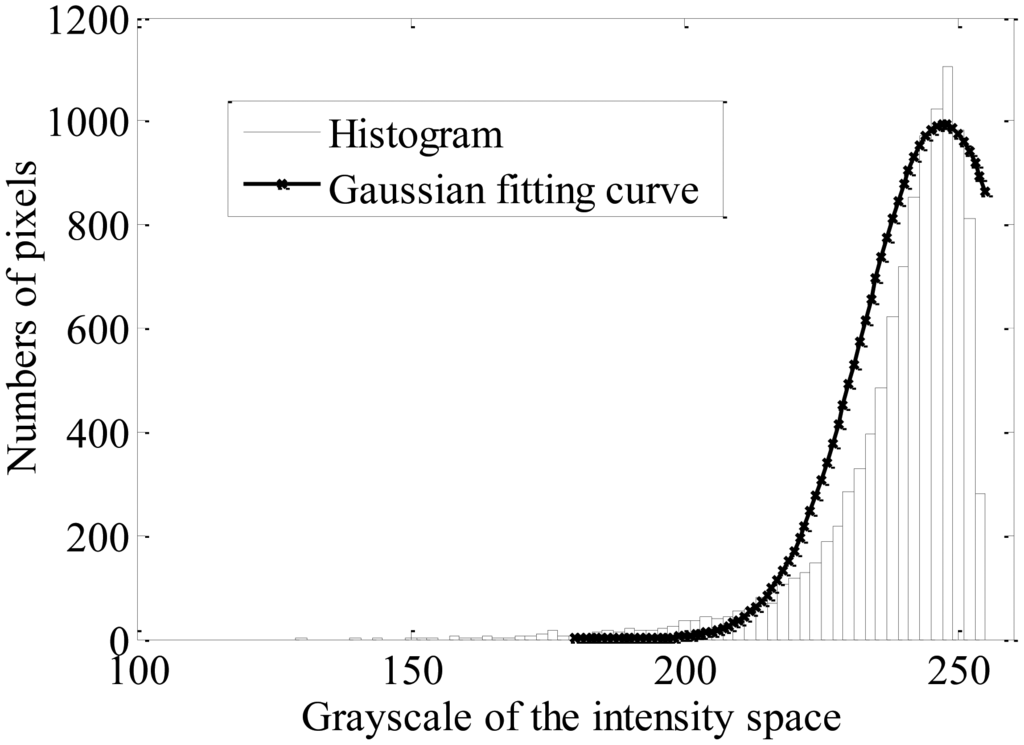 It can be observed that there is no special feature in the higher gray level interval in Figure 1a, while there is an obvious bimodal distribution in the corresponding interval in Figure 1b. The result shows that there is an obvious difference between the targets and the background in the cumulative histogram, which satisfies the application condition of the Otsu method. Moreover, as the taillight spots are concentrated in the brightest region, the segmentation should be implemented in the brighter region from a lower gray value to 255. First, a statistical segmentation threshold Ts is derived from the distribution of the taillights region in brightness histogram for a database of 300 images, which are captured in different traffic scenes. A Gaussian curve is fitted to the brightness histogram data, as shown in Figure 2, and the statistical threshold Ts is obtained as 214 at the probability point (μ − 2σ). By assuming that the statistical threshold Ts is the ideal threshold for segmentation, the initial segmentation threshold TI can be computed by: