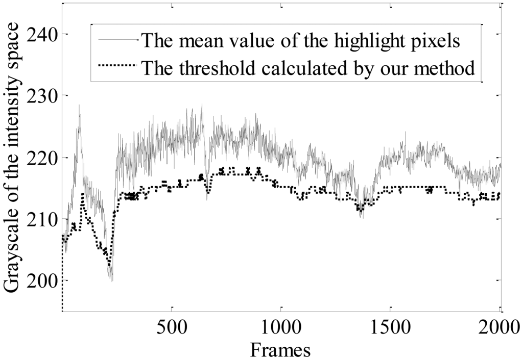From the above equations, it can be observed that the thresholds in this frame are mainly determined by the previous frame. The thresholds are extended to an extensive range based on the values of the previous frame. There are two advantages of the proposed tracking-based detection algorithm for implementing the PR-based detection rules. The first is that there is only one vehicle in the tracked rectangle, thus the thresholds can be centralized for a specific vehicle. In other words, the thresholds of one vehicle are only determined by the feature values of this vehicle in the previous frame. The second is that the rectangle is relatively small, the number of the disturbed bright spots is very small and thus a high detection rate can be derived.