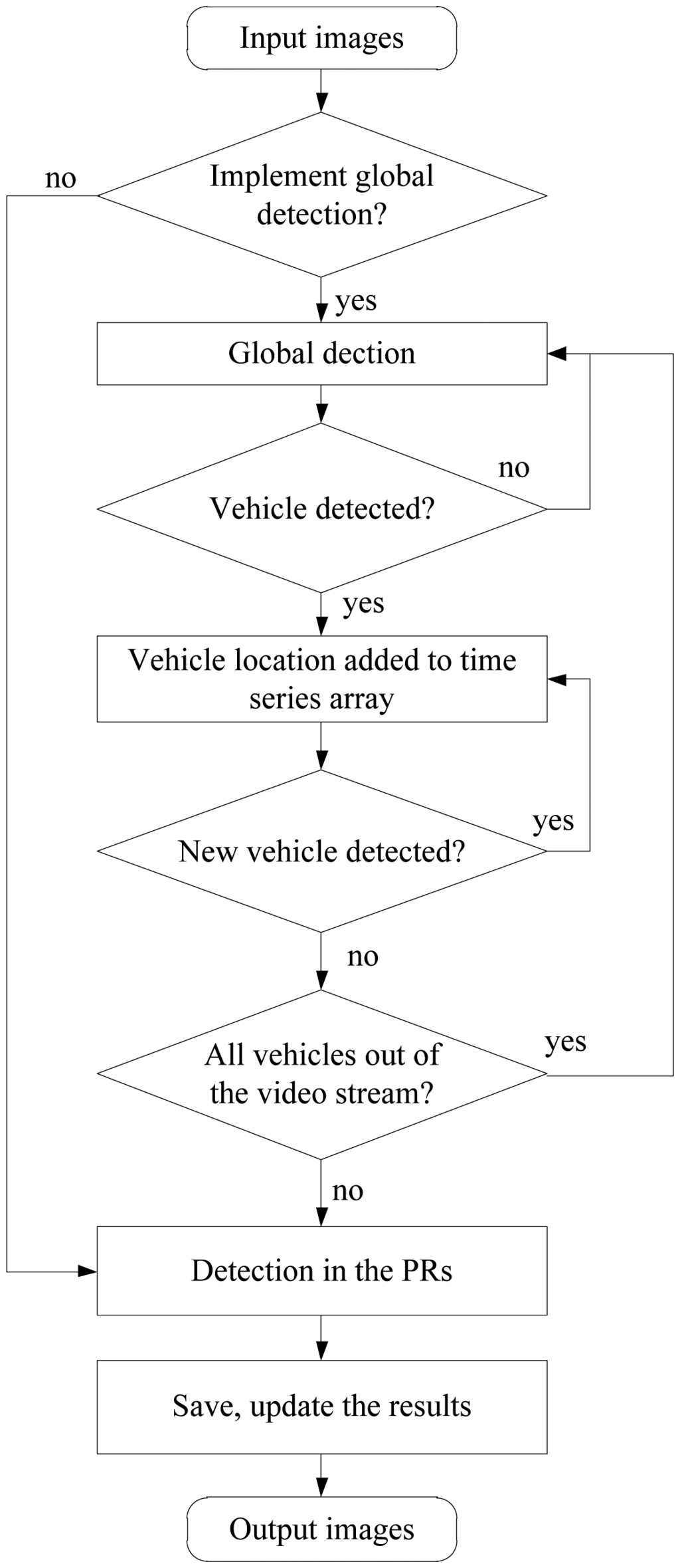 Figure 6 shows the vehicle detection process of the proposed method. The positions of the detected vehicles obtained by the global based detection algorithm of the previous five frames are added to the time series arrays to predict the vehicles' position in the next frame. The predicted vehicle positions are extended by five pixels outwards to get the PRs in the next frame, as shown in the second picture of Figure 6. The target vehicle in each PR is detected by the improved detection algorithm as described in Section 3.3. Finally, the detection result is added to the dynamic time series array, so the model could continue to predict the vehicle position in the subsequent frames.