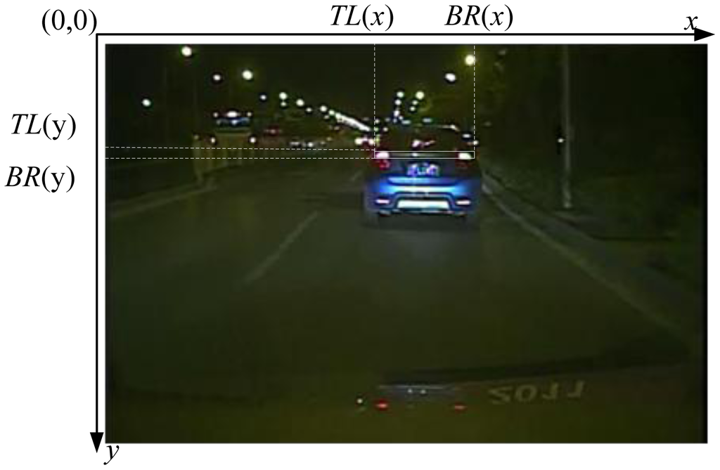 The four parameters of the bounding box surrounding the pair of the taillights (i.e., x-position and y-position of the top-left (TL) coordinates, x-position and y-position of the bottom-right (BR) coordinates) are regarded as the random tracking time series data to predict the position of target vehicles in the next frame image, as shown in Figure 5. It can be observed that the position of a target vehicle is determined by the top-left and bottom-right points. Therefore, the x-coordinate and y-coordinate of point TL and point BR are used to describe the position of the target vehicle in the two directions, respectively. Let L = [TL(x) BR (x) TL(y) BR(y)] represent the position of a target vehicle; then the target position at time t can be expressed as Lt = [TL(xt) BR(xt) TL(yt) BR(yt)], and the target position at the time series t1, t2,…, tk can be expressed as [Lt1, Lt2,…, Ltk].